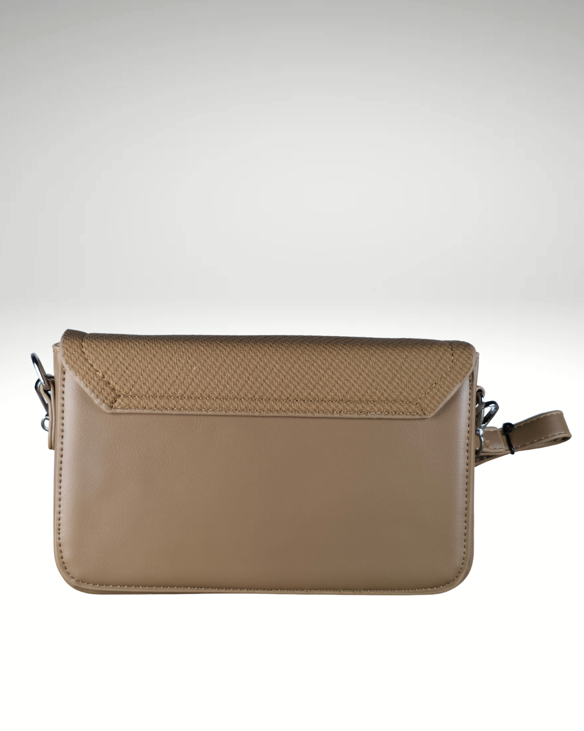 Design Bicolore Marron Sophistiqué : Similicuir taupe/marron clair et rabat à texture tissée noisette.