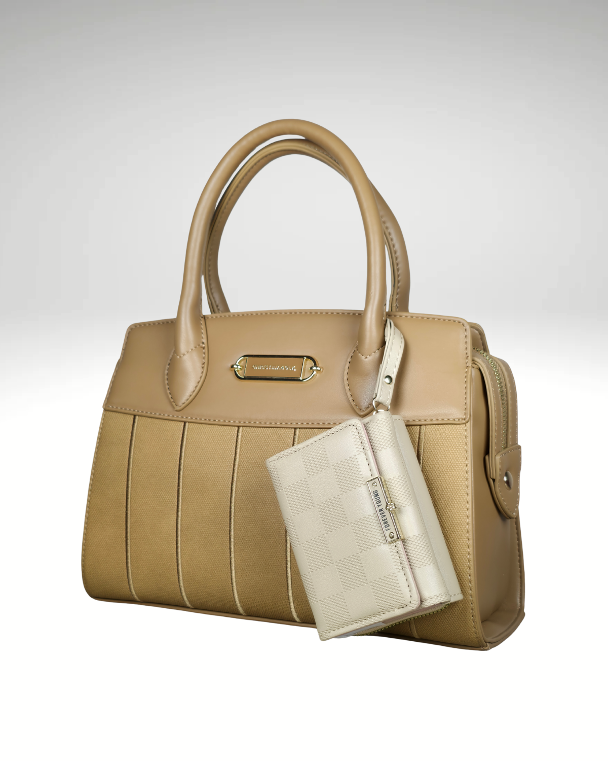 Ce sac à main présente une silhouette classique avec des poignées supérieures rigides et un corps élégant. Il se distingue par l'utilisation de deux textures : un similicuir lisse beige/camel sur la partie supérieure et les poignées, contrastant avec un panneau central orné de fines bandes verticales en toile texturée de couleur marron clair. Le sac est embelli d'une discrète plaque métallique rectangulaire dorée au centre, ajoutant une touche de raffinement. Il est complété par un petit porte-cartes/porte-monnaie amovible à motif damier clair et une bandoulière ajustable, le rendant à la fois chic et hautement fonctionnel.