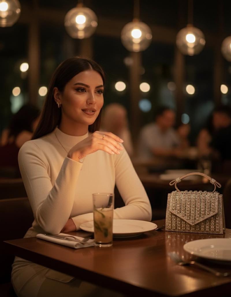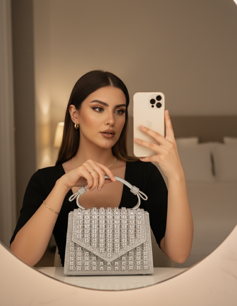 Poignée Élégante : Petite poignée supérieure ornée de strass, parfaite pour un porté chic à la main.